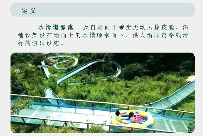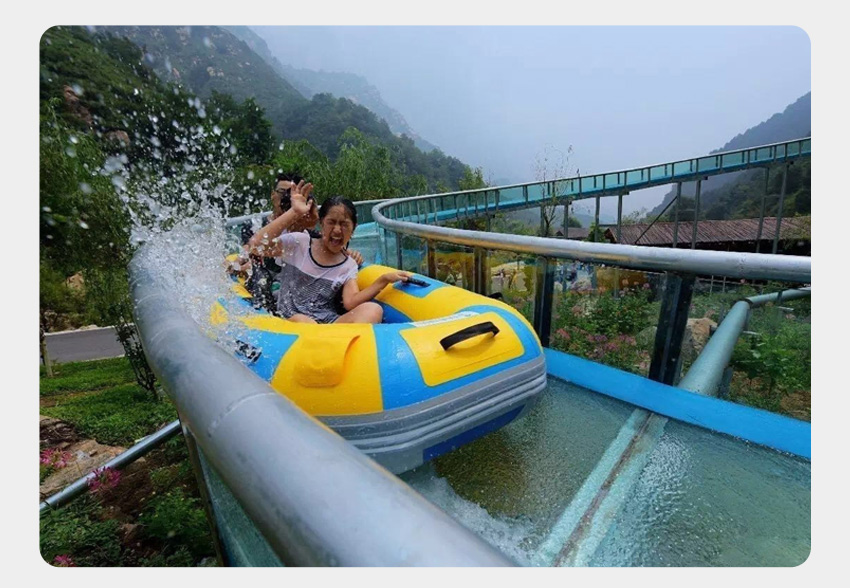 一是,依據(jù)大型生態(tài)漂流的體驗(yàn)感,設(shè)計(jì)優(yōu)化升級(jí)而來。依地勢修建漂流槽,槽內(nèi)水深約20公分,水在漂流槽中托船順流而下,速度可控,刺激與安全兼得,確保百分之三百的安全。在設(shè)計(jì)上我們可以做到游客在漂流過程中基本不濕衣物。我們暫且稱這種形式的漂流為水滑道漂流。