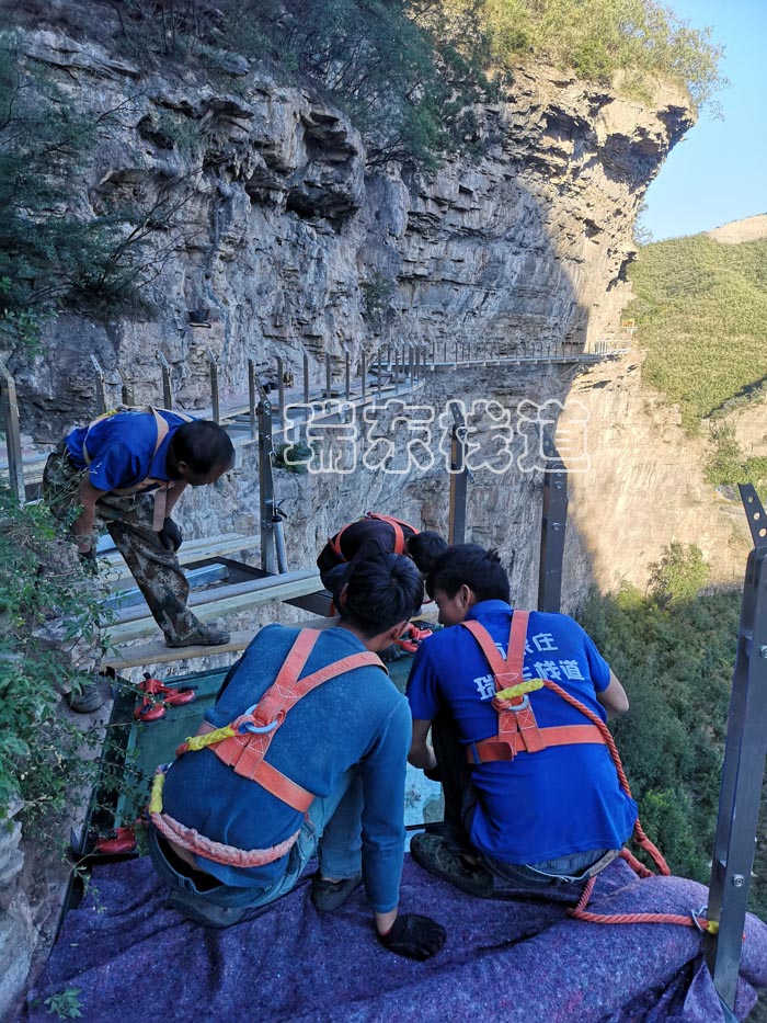 工人在對玻璃棧道施工的時候需要搭架子,而這架子便是工人們的安全保障。地面作業可以使用大型的機械,在懸崖峭壁上修棧道則全部都要靠人力了。